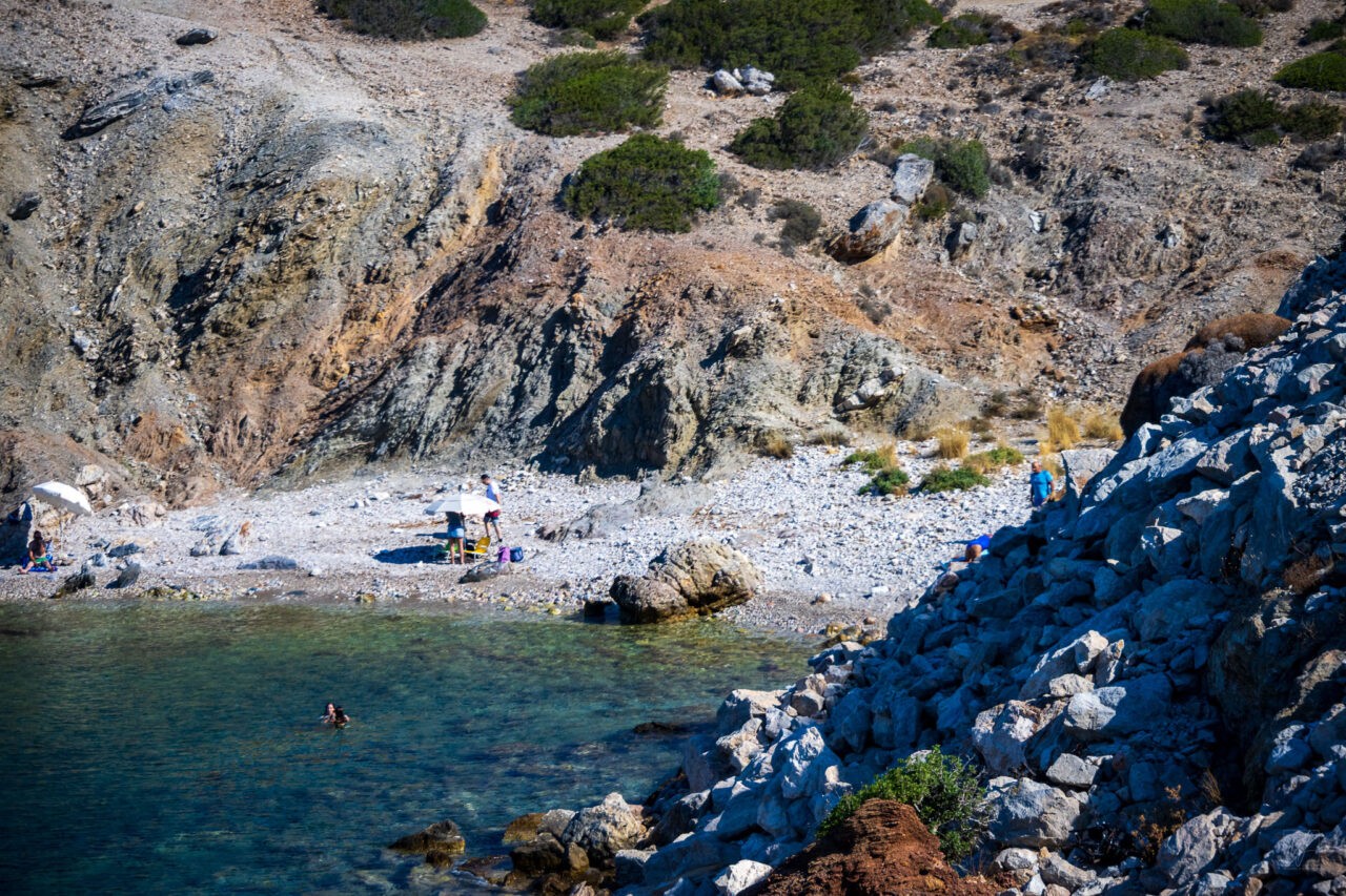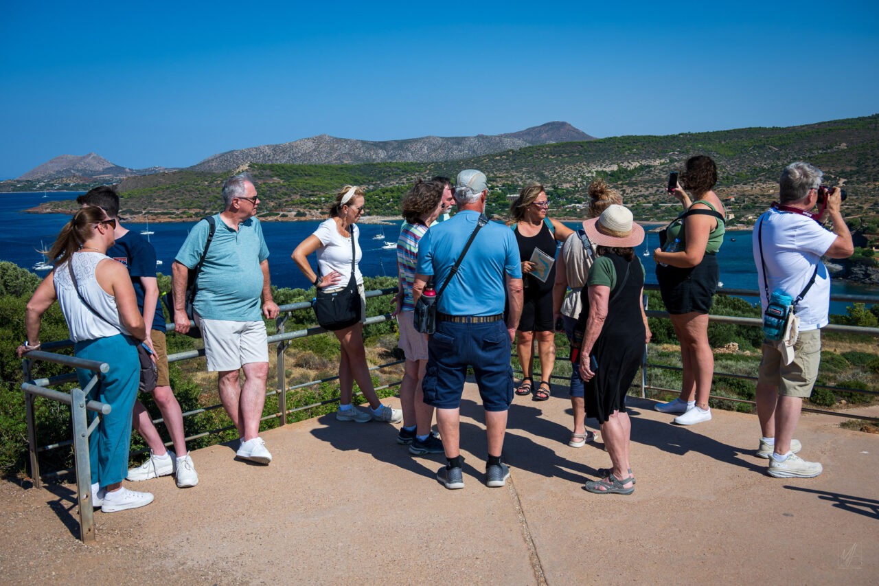We’re on the bus around 8:30a heading south on the Leof. Athinon Sounio highway passing the many coves and beaches on the way to Cape Sounion. It’s hot early at 88F/31C and the beachgoers are already cooling in the sea.