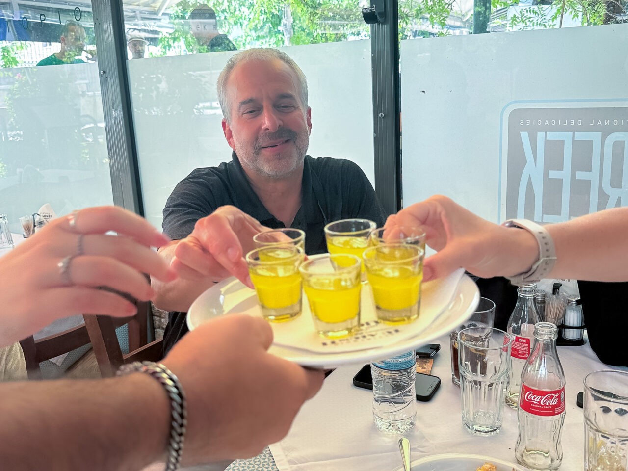 Then Sophie sends a text. Mallory’s sister Jordan just arrived from Boston Logan. It’s a surprise for Mallory when Sophie brings Jordan to the restaurant. Everyone cheers when the sisters unite. Jordan is here to join us for the cruise portion of the trip.
