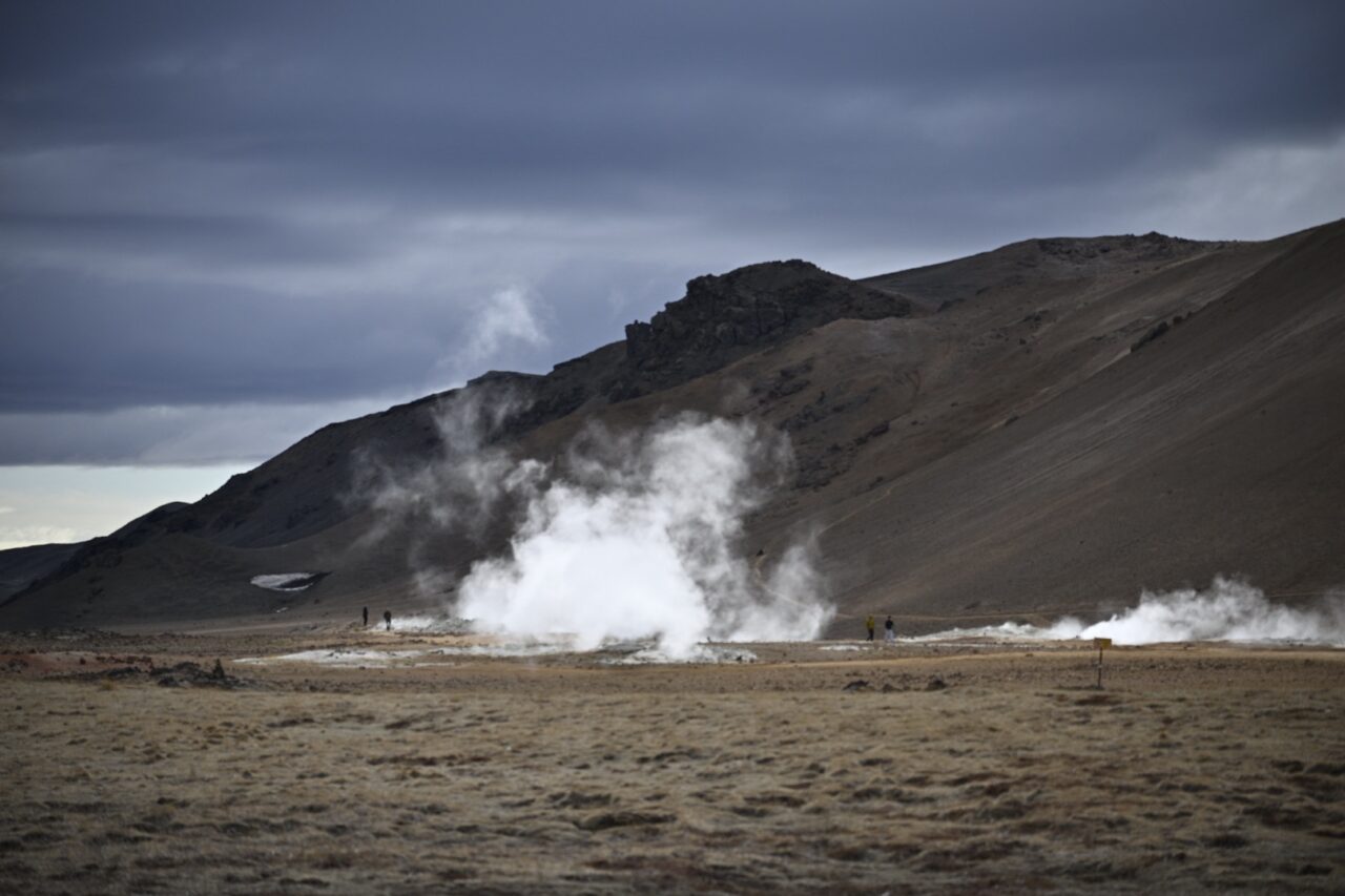 About 30 minutes down the road we reach the Lake Myvatn region. The lake was created by a volcanic eruption 2300 years ago, however, it’s a shallow lake averaging less than 10 feet of depth. During the winter months the lake freezes solid, but we visit the nearby high-temperature geothermal area called Námafjall. Sulfur fills the air.