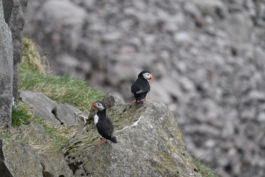 After Goðafoss we’re back on the bus for the quick drive to the seaside town of Húsavík. We pickup some lunch supplies to eat on the bus while we’re driving. On the way to the Dettifoss waterfall we stop at an overlook at Kópasker above the fjord with birds nesting in the cliffside. We’re here to see Atlantic Puffins. And we’re in luck! They’ve just arrived up north for the breeding season before heading south again in September.