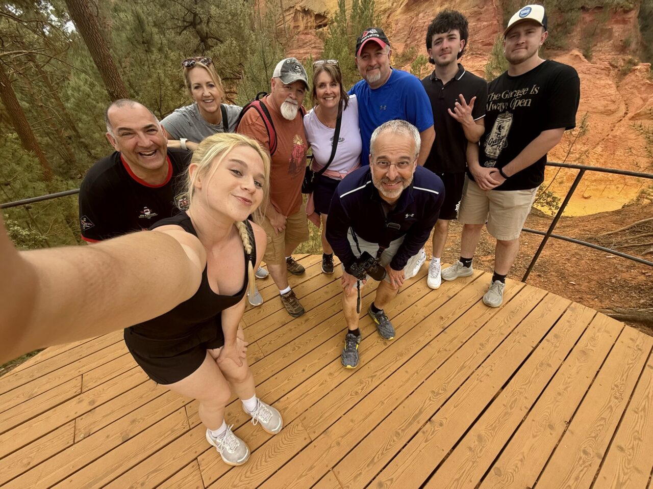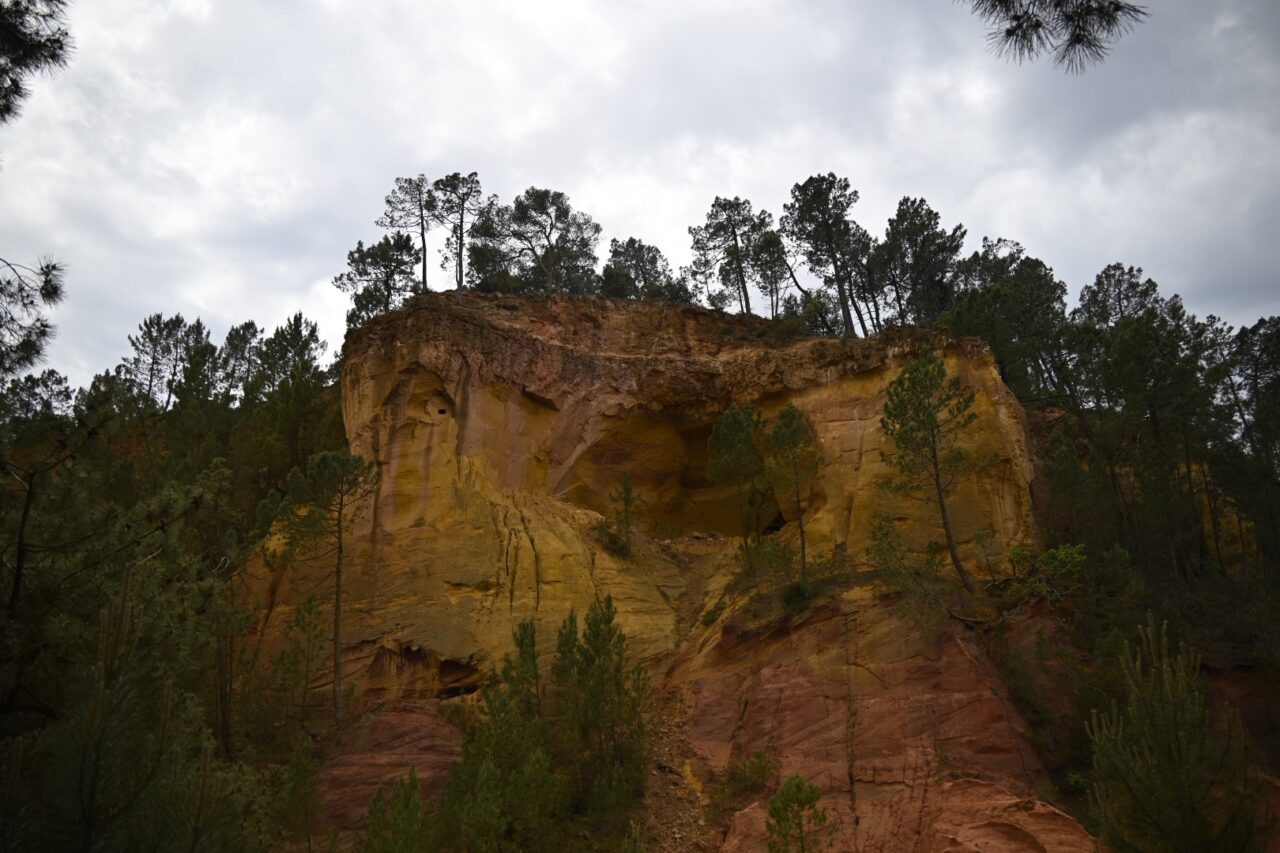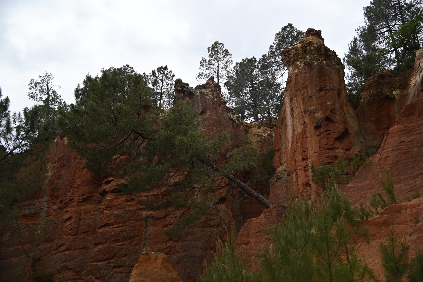 Just one stop today … a hike along the Ochre Trail. Located in the heart of Provence, within the department of Vaucluse and near the town of Roussillion, the trail loop features incredible rock formations with vibrant colors. We arrive about 12:30 PM. We’re advised that the ochre sand may temporarily stain shoes or clothes.
