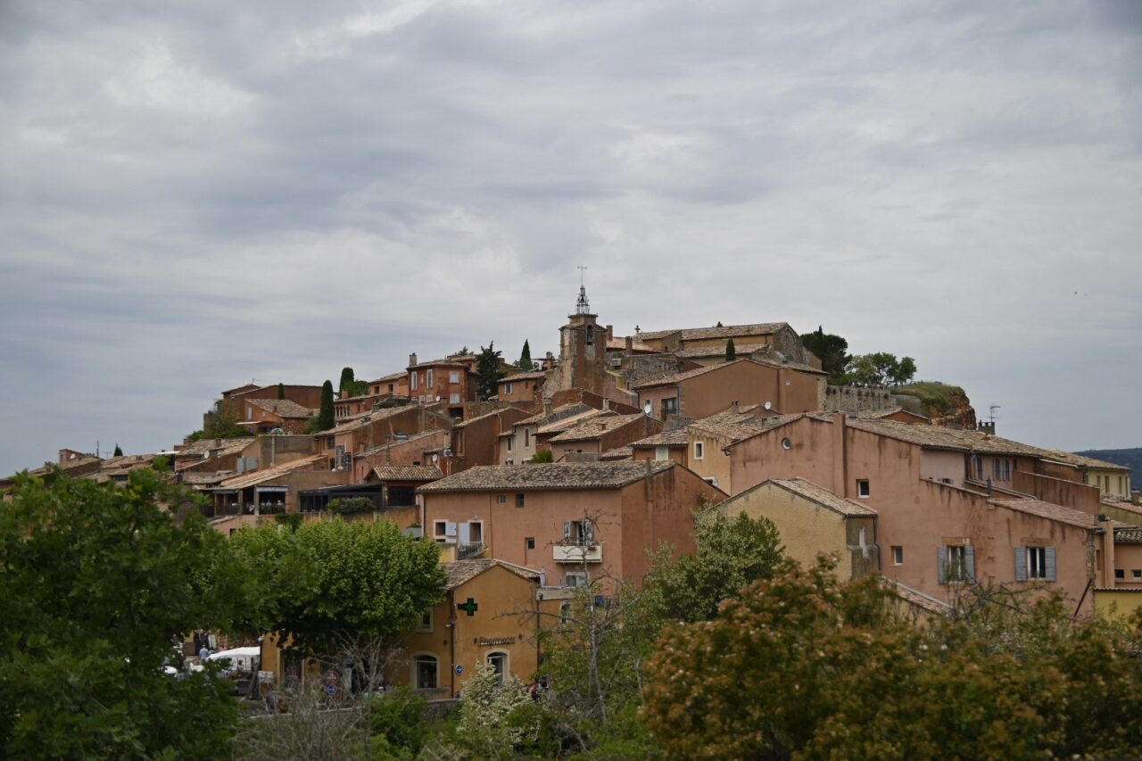 The trail walk takes about an hour. We finish just as it starts to rain. But the shower ends quickly and we walk into Roussillion. For lunch I have chorizo from Artisan Boulangerie to eat while exploring the village. Off in the distance I can see the peak of Mount Ventoux, a famous Tour de France finishing climb. Then Michelle and I enjoy a vino rosé at La Treille.