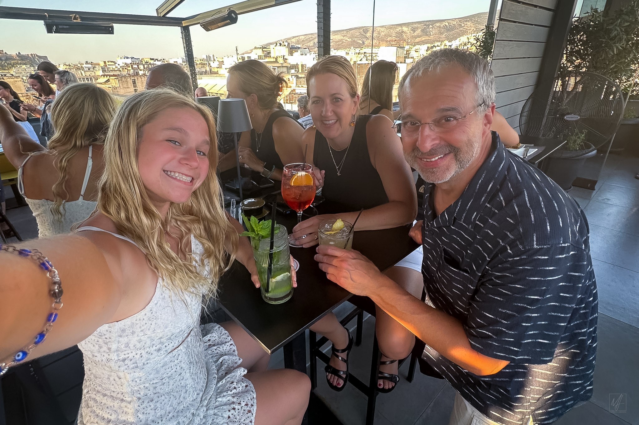 It’s our last night in Greece, so Sophie, Michelle, and I toast the end of the trip at the rooftop bar of the Polis Grand Hotel. The view is amazing!